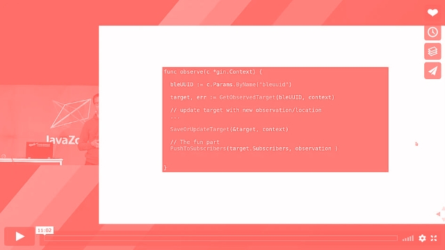 På javazone 2016 viste Nils frem hvor lett det er å overvåke alle bluetooth-enheter i nærheten med en egenlaget Android app og en backend skrevet i Go. Det blir ekstra skummelt når Nils sender dataene til google-appengine og lar alle med appen installert abonnere på puls-klokken til han som sitter ved siden av deg. Bluetooth var ikke bygd med tanke på personvern, det du har rundt håndleddet er en digital sauebjelle!