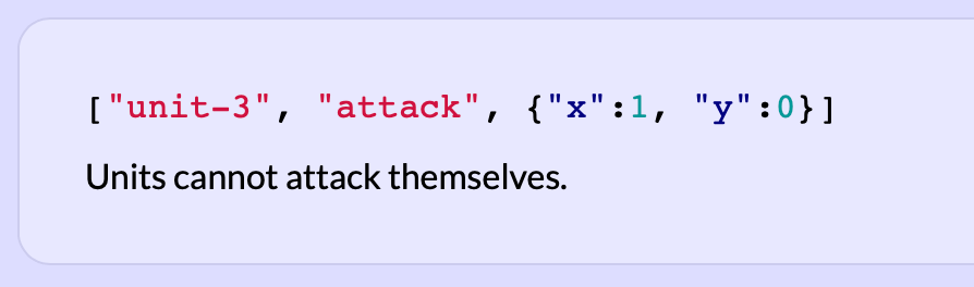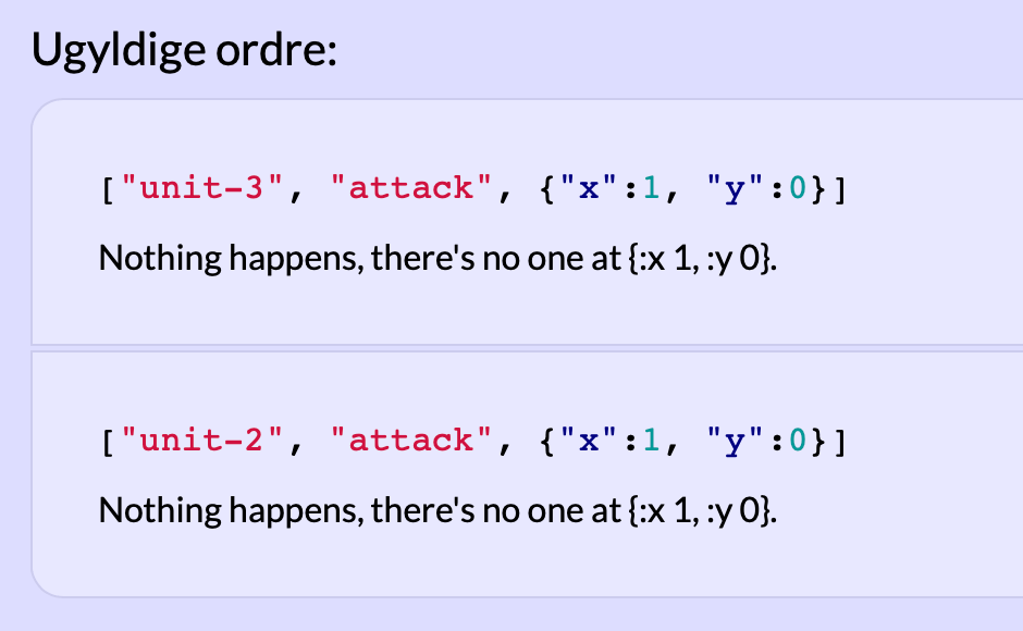 Det interessante er at man på forhånd ikke kan vite om en ordre er gyldig eller ei. Man må spille gjennom og prøve ordrene én etter én. Det endte opp med at koden for å gi gode feilmeldinger står for 150 av de 400 linjene som implementerer hele spillogikken.
