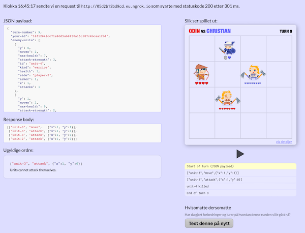 Her ser man både request JSON-payloaden som ble sendt fra serveren, og response body som endepunktet svarte med. Man ser listen over ugyldige ordre. Man får se spillet tegnet opp - og kan se ordrene bli spilt gjennom med play-knappen.
