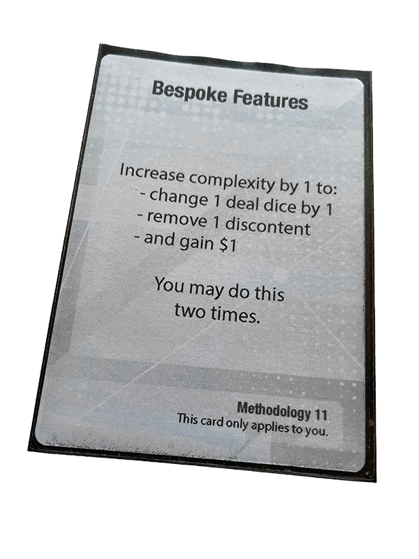 Her har vi et annet metodologi-kort. Med Bespoke Features kan man lage litt kode på si’ som kun én kunde etterspør. De blir mer fornøyd, man får noen penger i lomma, og … kompleksiteten på kodebasen øker. Det blir mer bugs, noe som igjen går ut over alle kundene. Får håpe ingen blir så misfornøyde at de stikker.
