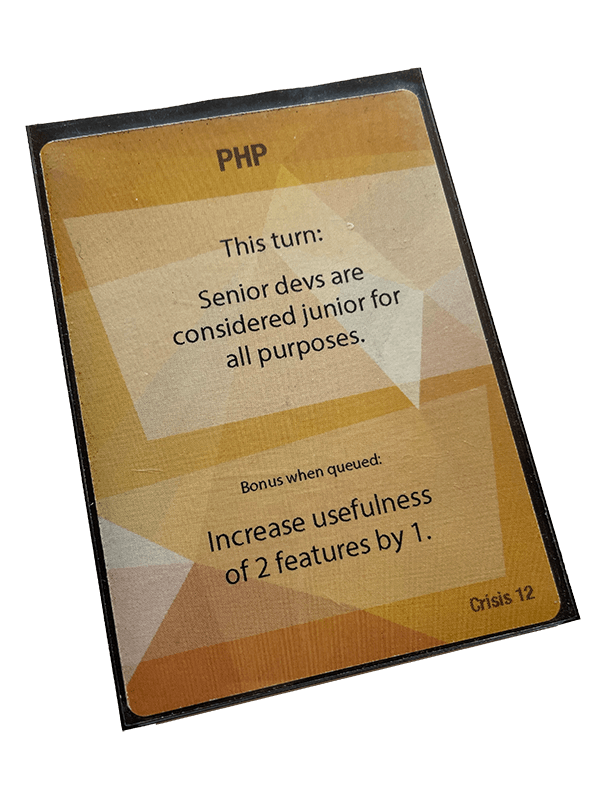 Legg merke til at den som spiller ut PHP-kortet får raskt utviklet litt ekstra nytteverdi. Det passer jo fint. Litt rask nytteverdi selv først, så må alle leve gjennom krisen et par runder senere.
