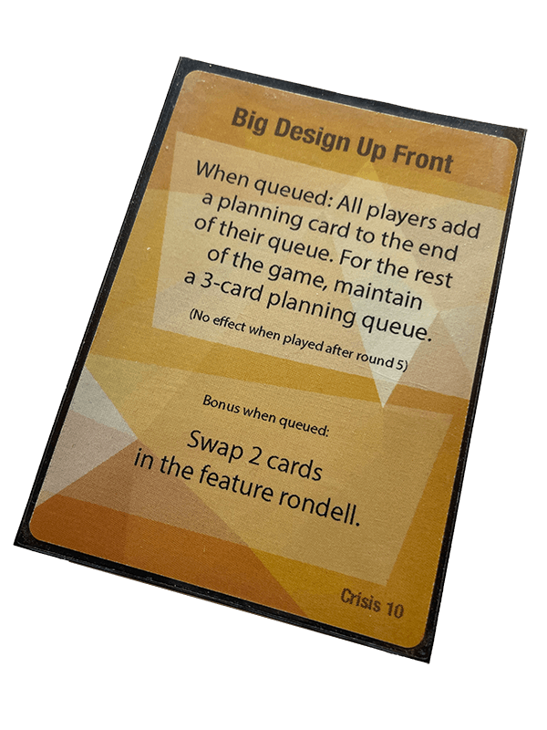 Disse oransje kortene representerer kriser. I motsetning til metodologi-kort, så vil kriser gå ut over alle spillerne rundt bordet samtidig.