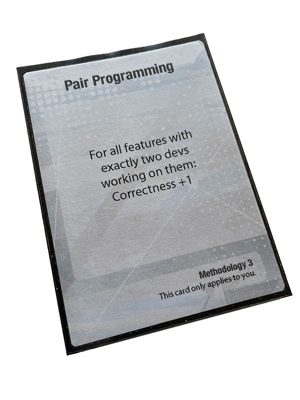 I tillegg til å dra i salgsmøter og utvikle features, så må man naturligvis også planlegge. Alle vet at planlegging er viktig. En av tingene man kan planlegge for i spillet, er å innføre nye metodologier. Et eksempel på det ser vi i bildet: Pair Programming.