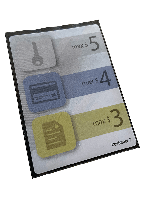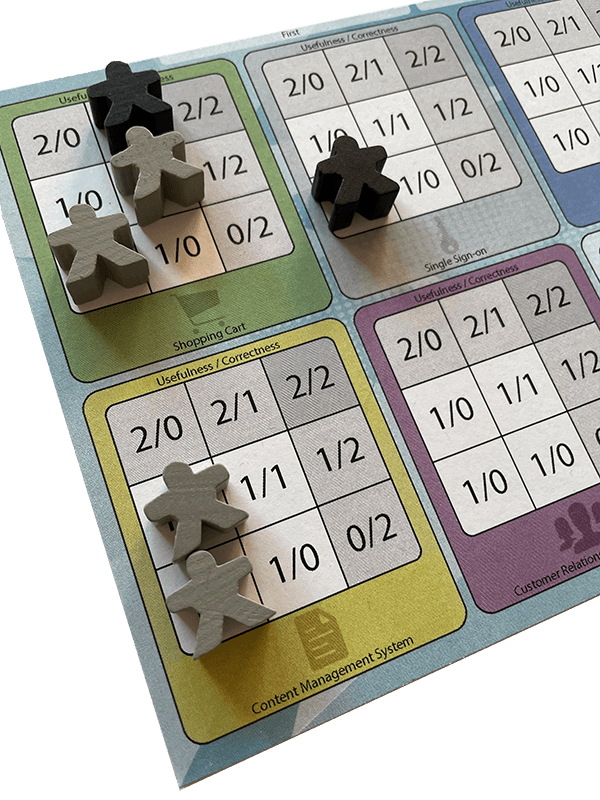 På midten av bordet ligger kunder som ingen enda har kapret. De er interesserte i forskjellige features. Kunden på bildet vil ha SSO, betalingsløsning og CMS (grå, blå, gul) med kvalitet henholdsvis 5, 4 og 3.