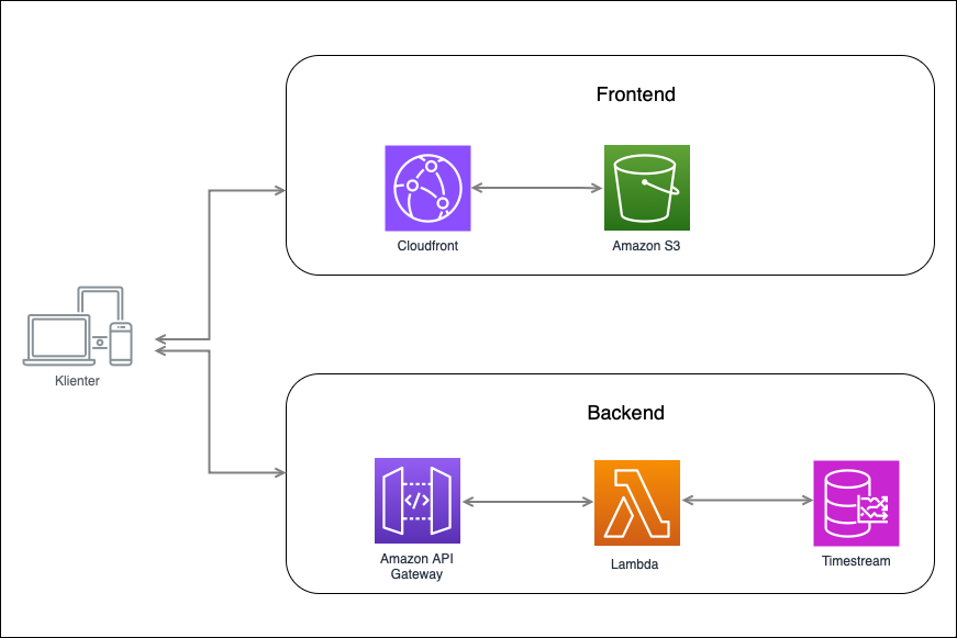 Her ser du en overordnet skisse der klienter først henter nettsiden, og videre data fra backend