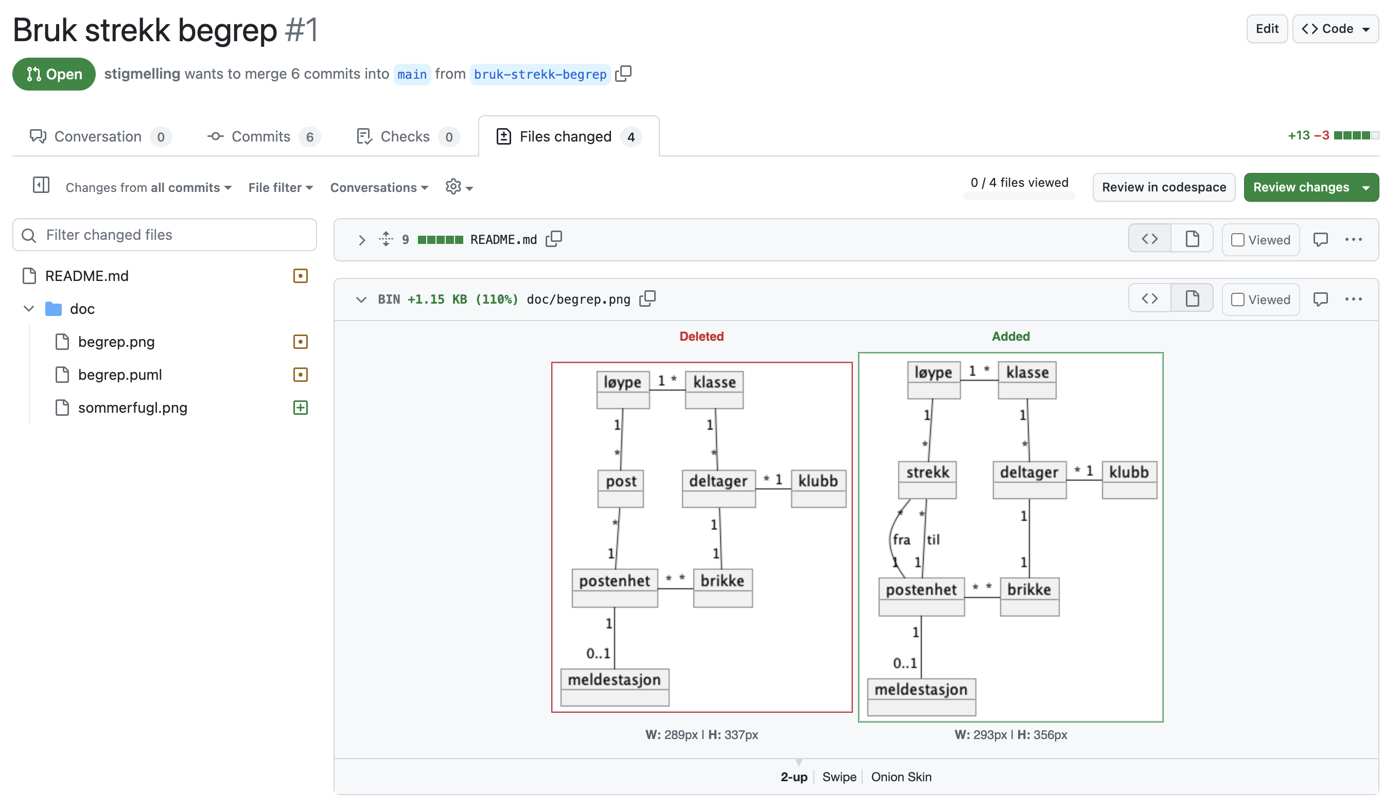Bruk tekstbaserte modeller ala plantuml slik at endringer i “figuren” lett kan sees ved en diff i en commit.