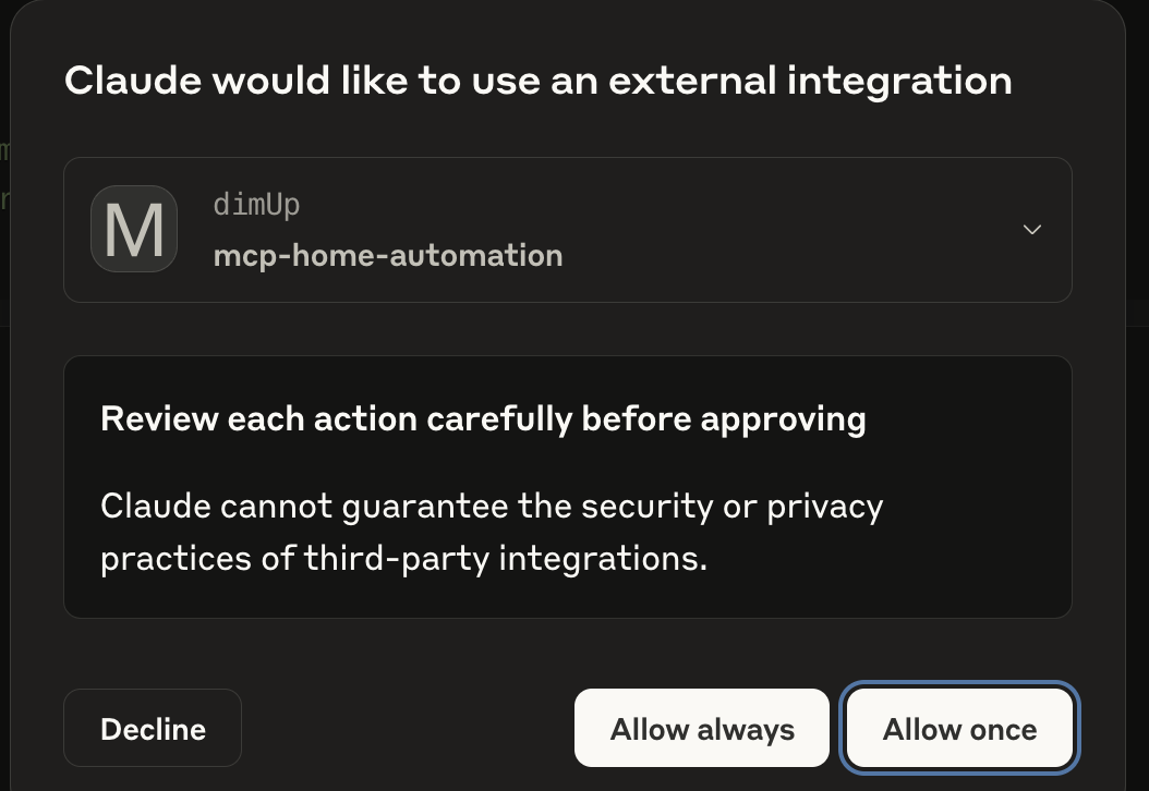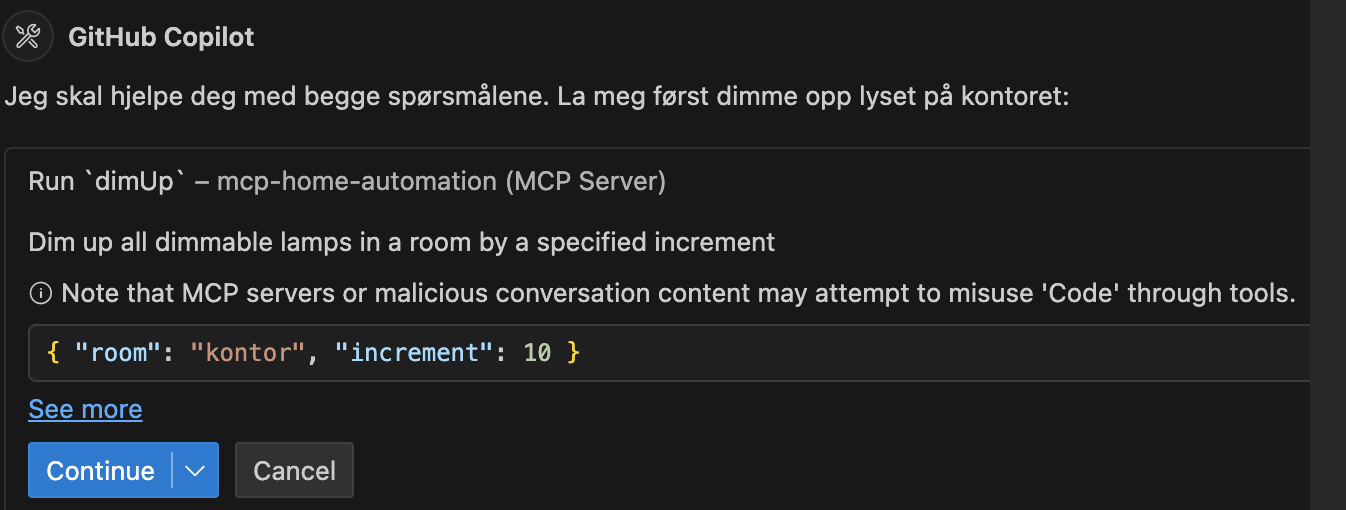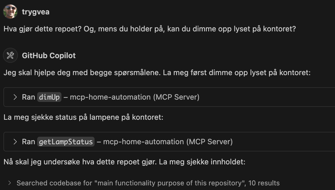 Si nå for eksempel at vi vil pakke inn styring av lyset hjemme som en MCP-tjeneste. Sånn at vi kan spørre Claude klienten eller Cursor om “hvilke lamper er på i stuen” og gi kommandoer som “kan du dimme opp lyset på kjøkkenet”. La oss anta at vi allerede har implementert to javascript-funksjoner, getLampStatus og dimUp ved hjelp av et hjemmeautomasjons-api: