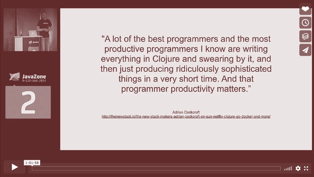 Clojure er en Lisp-dialekt som kjører på JVM-en (i tillegg til CLR-en og JavaScript). Det er et dynamisk og kompilert programmeringsspråk som er designet for å integrere tett med sin host-plattform. Til tross for dette er Clojure primært et funksjonellt programmeringsspråk med persistente datastrukturer og et standard-API som er spesielt god egnet for parallelisering.